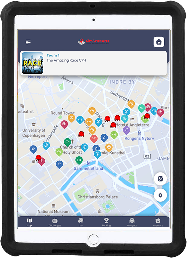 Vores event manager møder dig på det aftalte sted og deler gruppen op i hold. Hvert hold får en iPad og holdene starter med at tage et sjovt gruppebillede. Når du så starter spillet, viser et kort på iPad’en, hvor du skal hen. Hvert sted du besøger, venter der en udfordring, der kan give dig point. Efter cirka 70 minutter samles vi for at kåre vinderholdet og uddele medaljer.